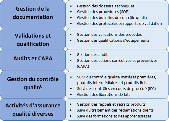 - la recherche de l’amélioration continue (gestion des audits, gestion des actions correctives et préventives (CAPA), suivi et de contrôle des formations et des apprentissages du personnel, etc…).
