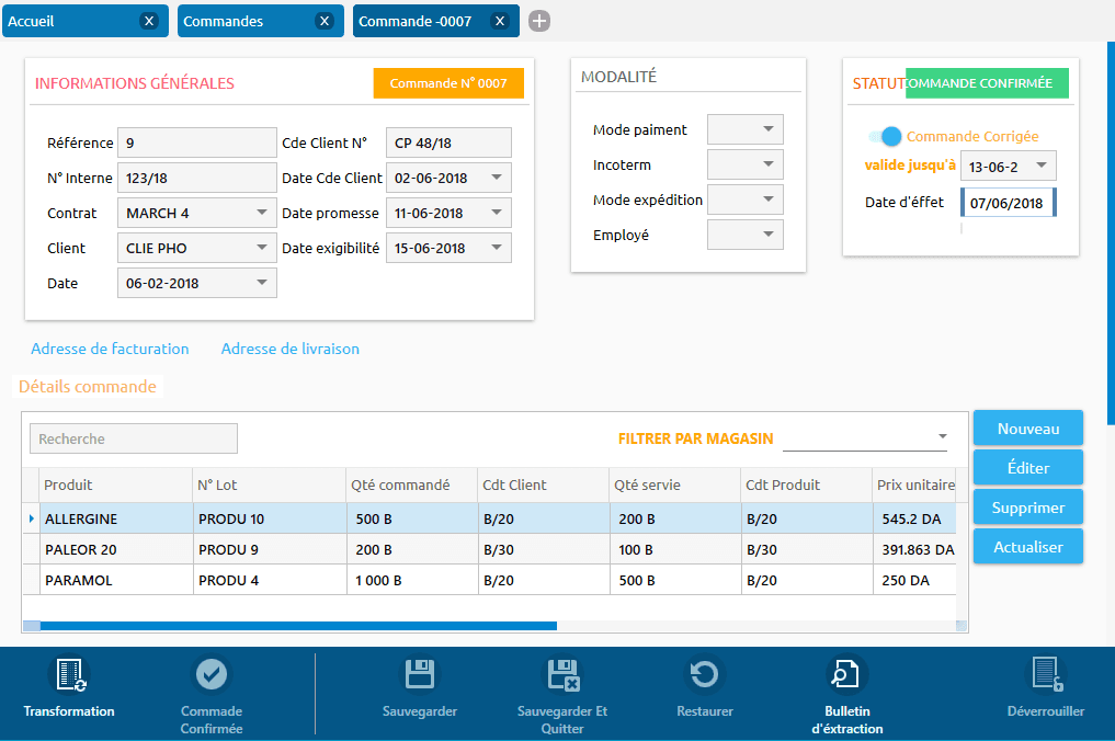 - Traitement des commandes clients avec suivi individualisé des étapes du traitement (préparation commande, extraction des stocks, contrôle commande, etc…)
